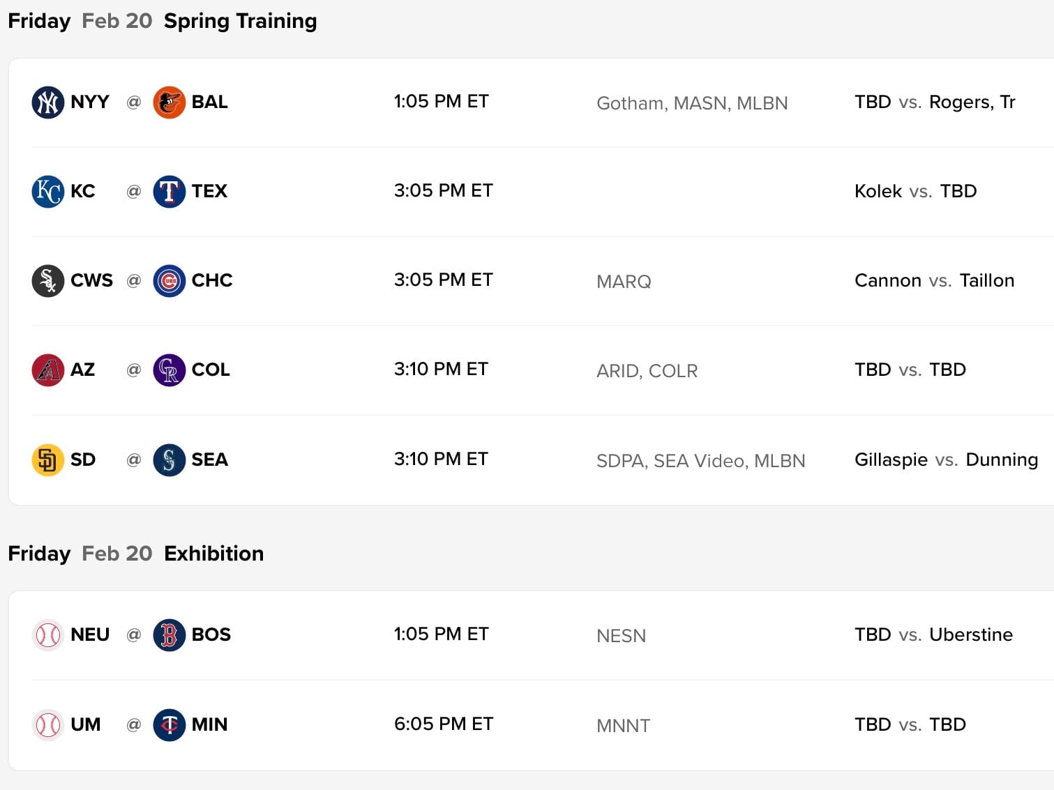 Note: The teams that the Red Sox and Twins are playing in exhibition games are Minor League teams. The Red Sox are playing the Huskies and the Twins are playing the Golden Gophers.